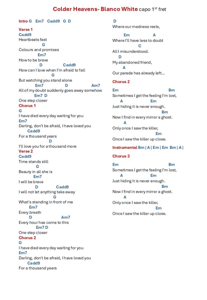 Welcome to my guitar lesson and chord sheet of Colder Heavens by Blanco White. Colder Heavens is a song by English singer-songwriter Josh Edwards, known as Blanco White. Colder Heavens was released in 2017. The song is in the key of Fm but here I play it with a capo on the 1st fret using the chords G, Em7, Cadd9, D, Am7 and Bm.