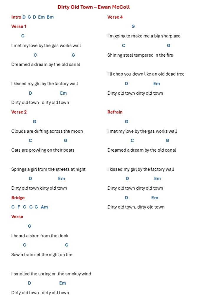 Welcome to my guitar lesson and chord sheet of Dirty Old Town by Ewan McColl. Dirty Old Town is a song by English folk singer-songwriter Ewan McColl. The song was made popular by Irish folk band The Pogues, I have used their version for this lesson. Dirty Old Town (The Pogues version) is in the key of G and has a key change in the instrumental, where it goes to C. It has the chords G, C, D, Em, F and Am.