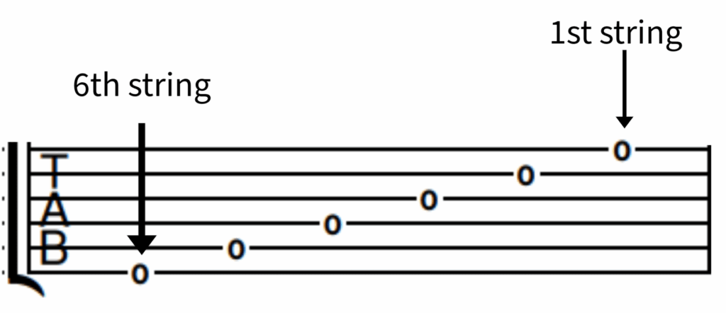 A guitar TAB has six horizontal lines representing the six strings of the guitar- the bottom line is the low E string, and the top line is the high E string.