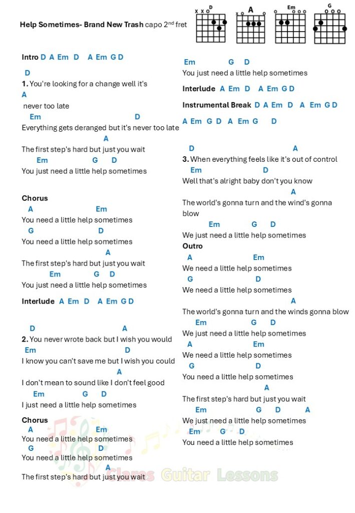 Welcome to my guitar lesson and chord sheet of Help Sometimes by Brand New Trash