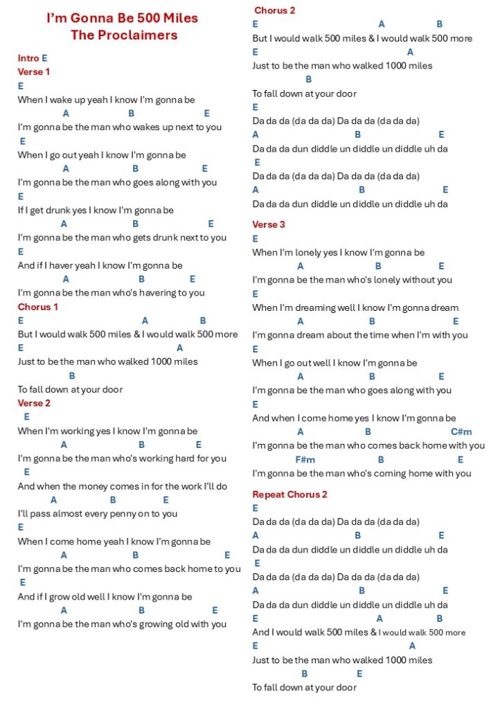Welcome to my guitar lesson and chord sheet of I’m Gonna Be 500 Miles by The Proclaimers. I’m Gonna Be 500 Miles was released in 1988 from The Proclaimer’s second album Sunshine On Leith. The song is in the key of E and has the chords E, A, B, C#m and F#m.
