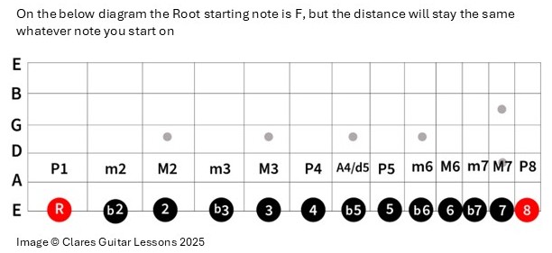 An interval is the distance between two notes. On guitar intervals are measured in frets, with each fret equal to one semitone (or half step).