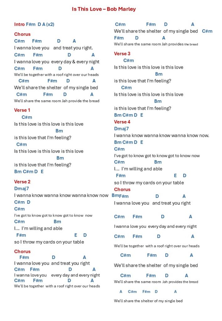 Welcome to my guitar lesson and chord sheet of Is This Love by Bob Marley And The Wailers. Is This Love is from the 1978 album Kaya. The song is in the key of A and has the chords F#m, D, A, C#m, Bm and E.