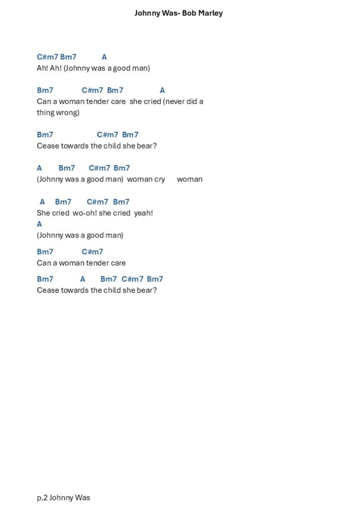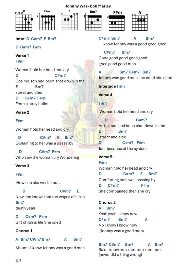 Welcome to my guitar lesson and chord sheet of Johnny Was by Bob Marley And The Wailers. The song has the chords D, C#m, E, Bm7, F#m and A.