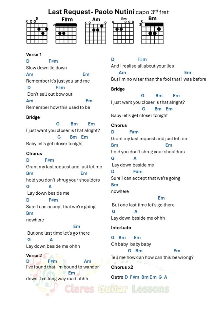 Welcome to my guitar lesson and chordsheet of Last Request by Scottish singer-songwriter Paolo Nutini. The song is played with a capo on the thrid fret and has the chords D, F#m, Am, Em and Bm.