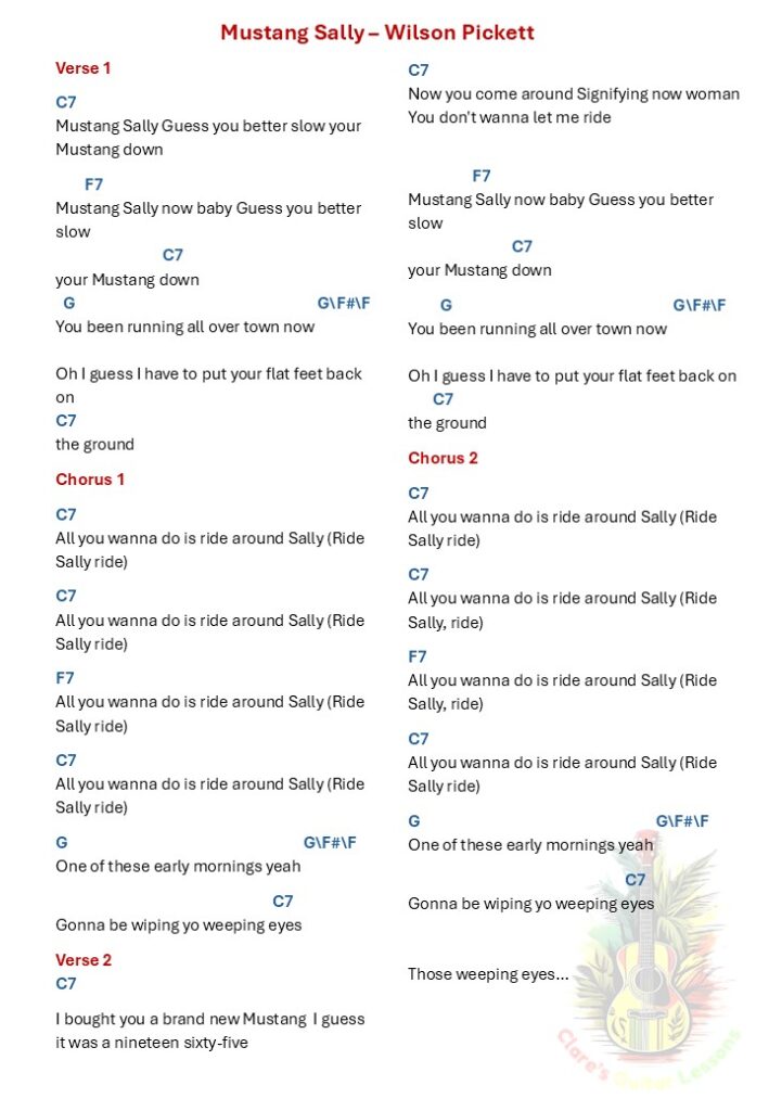 Welcome to my guitar lesson and chord sheet of Mustang Sally by Wilson Pickett. Mustang sally is a song by American R&B singer Mack Rice and was released in 1965. It was covered the next year by Wilson Pickett. The song has the chords C7, G7, F7 and F#.