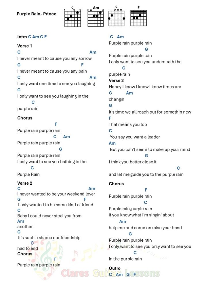 Wecome to my guitar lesson and chord sheet of Purple Rain (reggae version) by American musician Prince. Purple Rain was released in 1984. This reggae version is in the key of C and has the chords C, G, Am and F.