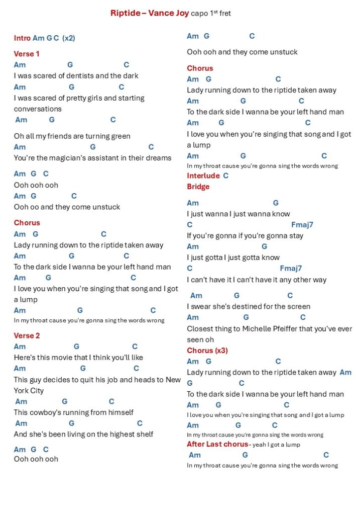 Welcome to my guitar lesson and chord sheet of indie-pop song Riptide by Vance Joy. Riptide was released in 2013 by Australian singer-songwriter Vance Joy. It has become one of the biggest hits of the 2000s. The song is in the key of Db and is played with a capo on the 1st fret with the chords Am, G and C for most of the song. The bridge is a little different with the chords Am, G, C and Fmaj7.