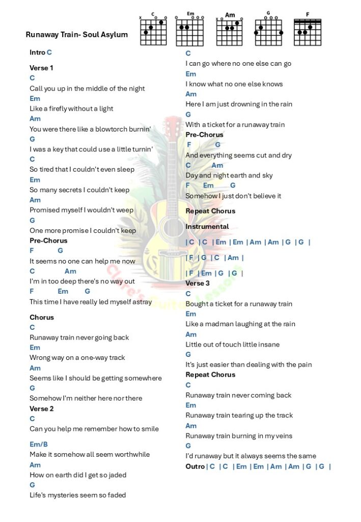Welcome to my guitar lesson and chord sheet of Runaway Train by Soul Asylum. Runaway Train was released by Amercian alternative rock band Soul Asylum in 1993 and became a massive hit around the world. The song has a melancholy feel and is fairly straight forward to play on guitar with the chords C, Em, Am, G and F.