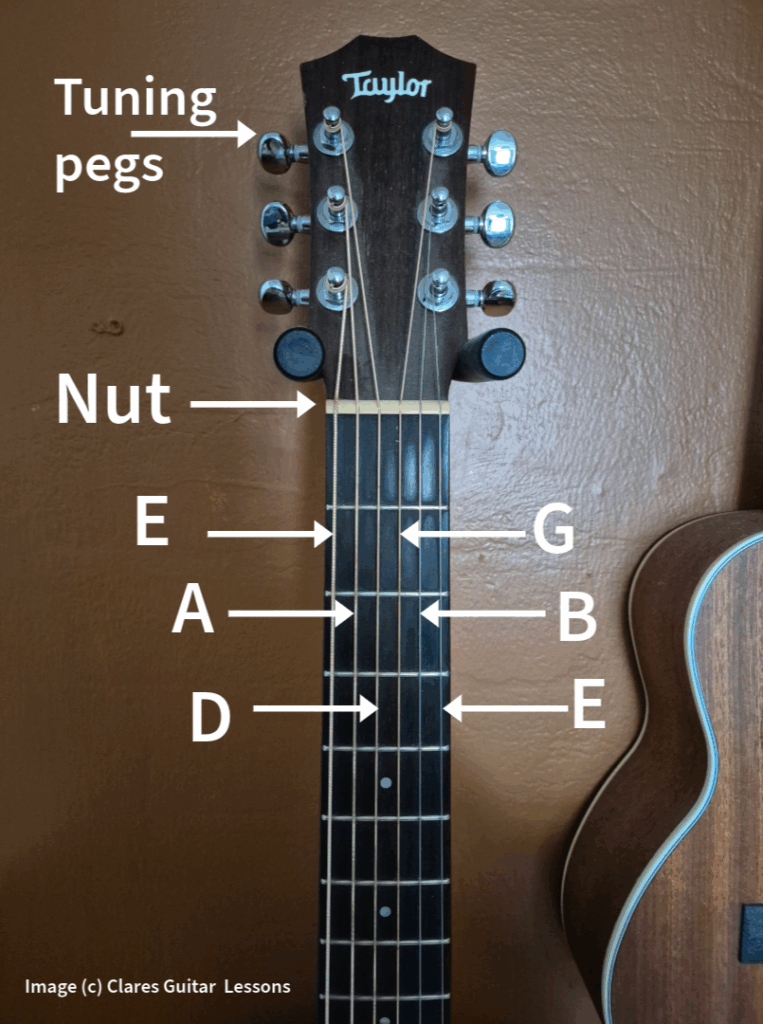 Get used to hearing the sounds of your strings and strumming them open. You can tune your guitar using an app on your phone or a clip on tuner, you can also tune your guitar using the strings as a reference. See lesson one on the page beginenners guitar lessons on how to hold and tune your guitar.