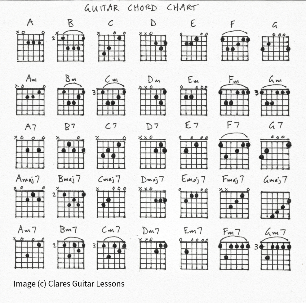 The next step is to learn some chords- begin by learning G, C, D, Em, Am, A, D and E. Take time to get your fingers used to finding the chord shapes and making sure each note is nice and clean sounding.