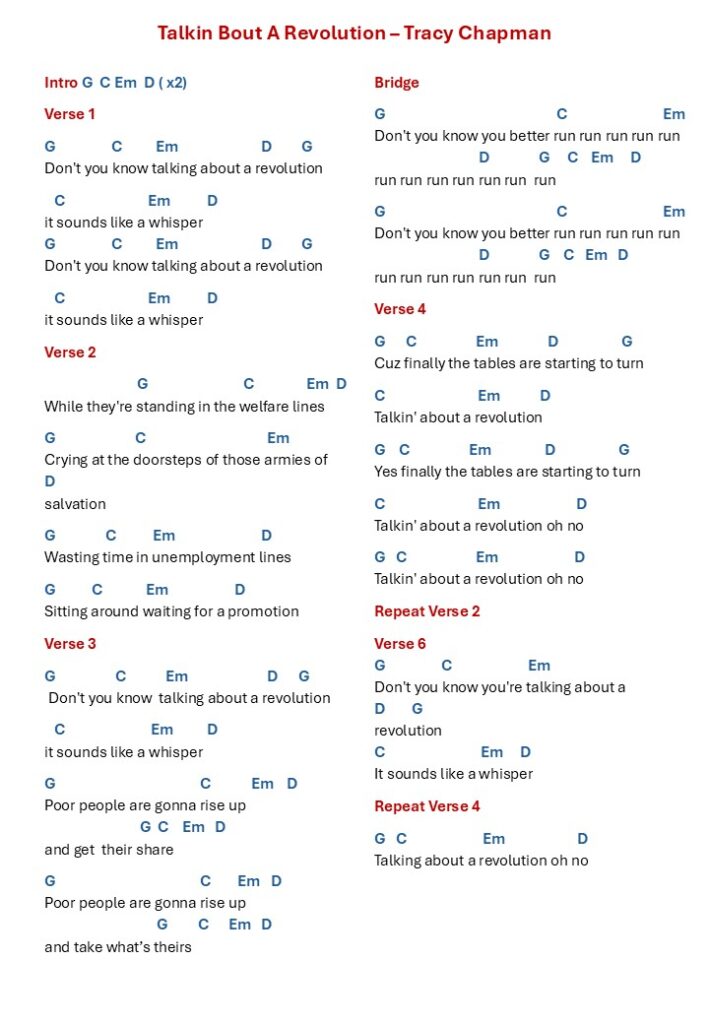 Welcome to my guitar lesson and chord sheet of Talkin Bout A Revolution by American singer-songwriter Tracy Chapman. Talkin Bout A Revolution is from Tracy CHapman’s self titled debut album released in 1988. The song has the same chords all the way through- G, C, Em and D.