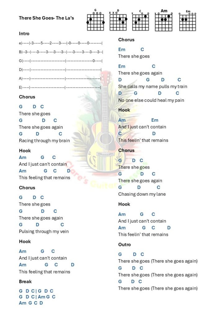 Welcome to my guitar lesson and chord sheet of There She Goes by The La’s. There She Goes has the chords G, D, C, Am and Em. The song has a catchy little riff played on the first and second strings.