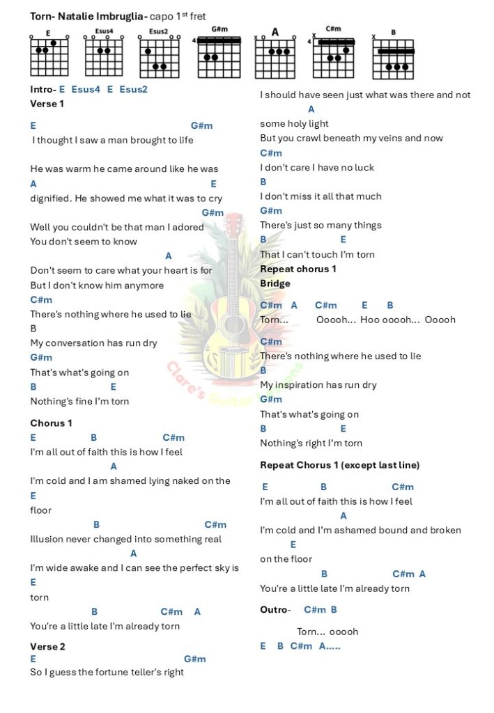 Welcome to my guitar lesson of Torn by Natalie Imbruglia. The song is in the key of F and this version uses a capo on the 1st fret with the chords E, Esus4, Esus2, G#m, A, C#m, and B.