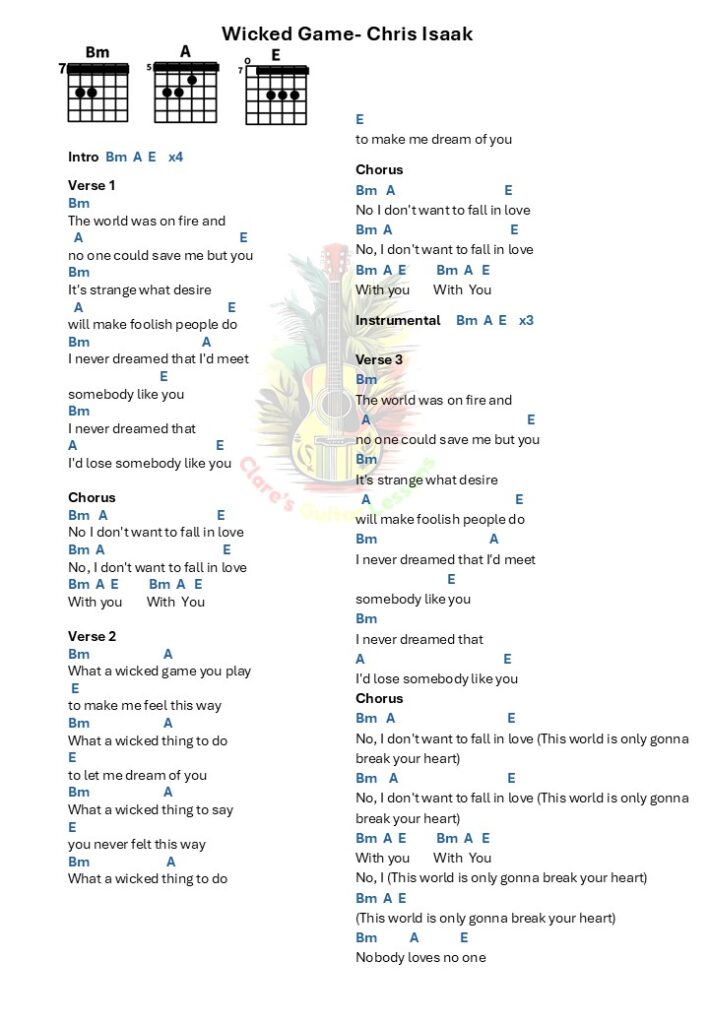 Welcome to my guitar lesson and chord sheet of Wicked Game by Chris Isaak (reggae version). The song has the same three chords throughout- Bm, A and E.